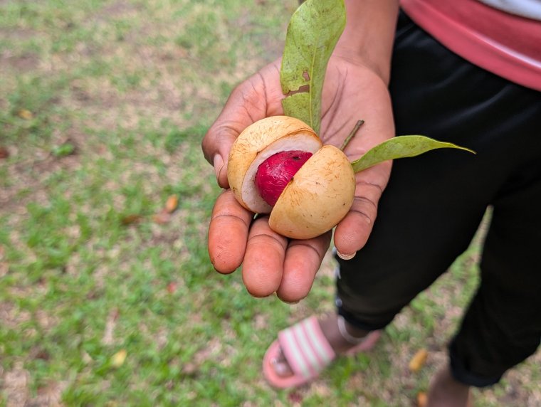 Lots of tips and shared information to help make our cruising life more fun and easier. The first week I got a rental car for the month for only $600. This made it much easier to go to other events, like a sunday morning walking group, and mexican dominos. Mexican Dominos is quite popular with many of the cruisers. Not just in Grenada, but in other areas too. I also went on a few activities with some of the ladies including a trip to Laura's Garden . We had a lovely gal from the UK who told us all about the many edible plants that grow on Grenada. I've included a photo of the Nutmet. You actually use the nut that is located underneath the red covering shown here. Who knew!