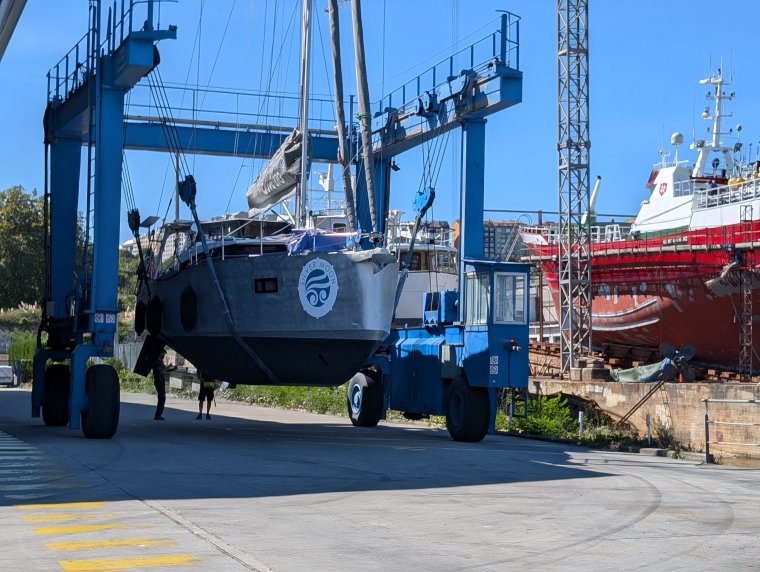 The metal fabricator wanted the boat out of the water so it was easier to install the new davit system, so we hauled the boat on September 3, and put her on the hard.