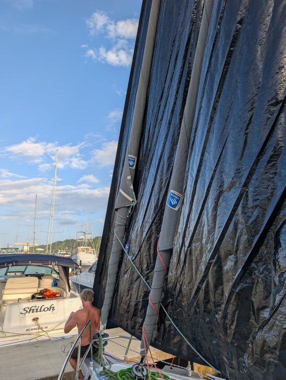 I still think you guys have had it easy buying a new boat. A lot of people have had way bigger things than a disk and some screws that were wrong. Andrew wonders if you are still happy that you bought the boat you bought? You’re code zero looks like shiny fabric. What is that?