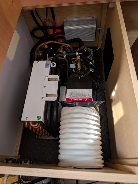 Marine AC unit installed: We ordered this from Alibaba and it costs less than $1500 delivered. With all the additional parts and adding the Freon the whole project cost less than $2000. This may not look very sexy, but I love it! We installed it at the settee by the shower, and BOY does it work GREAT!