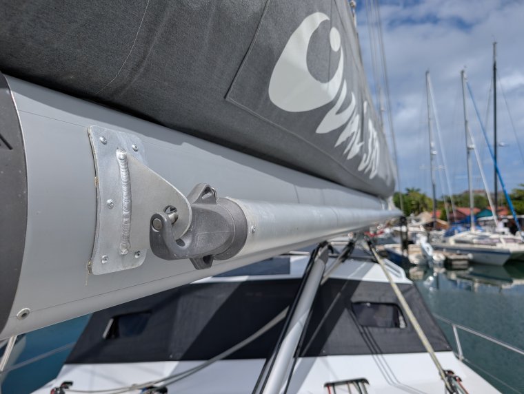 We had purchased a new whisker pole in Martinique, so that we could sail wing on wing. But where to put it? I decided that the boom was the perfect place. We now have a MUCH bigger boom, because the old one had broke on the way from Las Palmas to Cabo Verde. In Martinique we had custom aluminum brackets made and Blair finally had time to get to this project while we were at the dock.