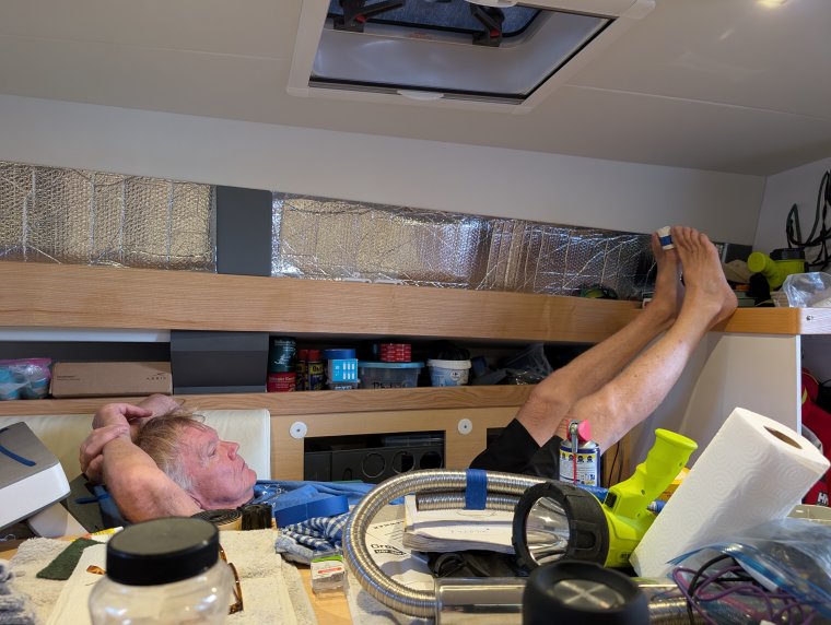 Diesel Hot Water Heater Installed. Blair installed this, so that we won't have to use solar power to heat the water, and could basically have hot showers and hot water for dishes anytime. He installed it in the back of the boat, so I don't even notice it's there. This was a 10 day project. Sorry No Photos for this, as it's located in the port stern by the steerling system.